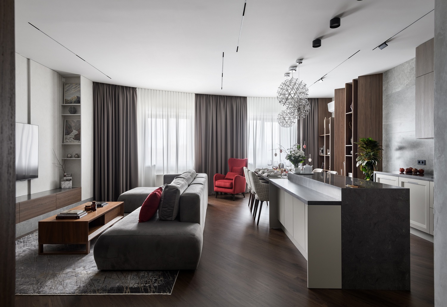 И это был бы хороший современный интерьер для жизни, если бы на сцену не вышел тот самый дорогой оттенок красного. Одно яркое кресло и лёгкий декор — и весь интерьер заиграл иначе: дорого, самобытно, статусно.