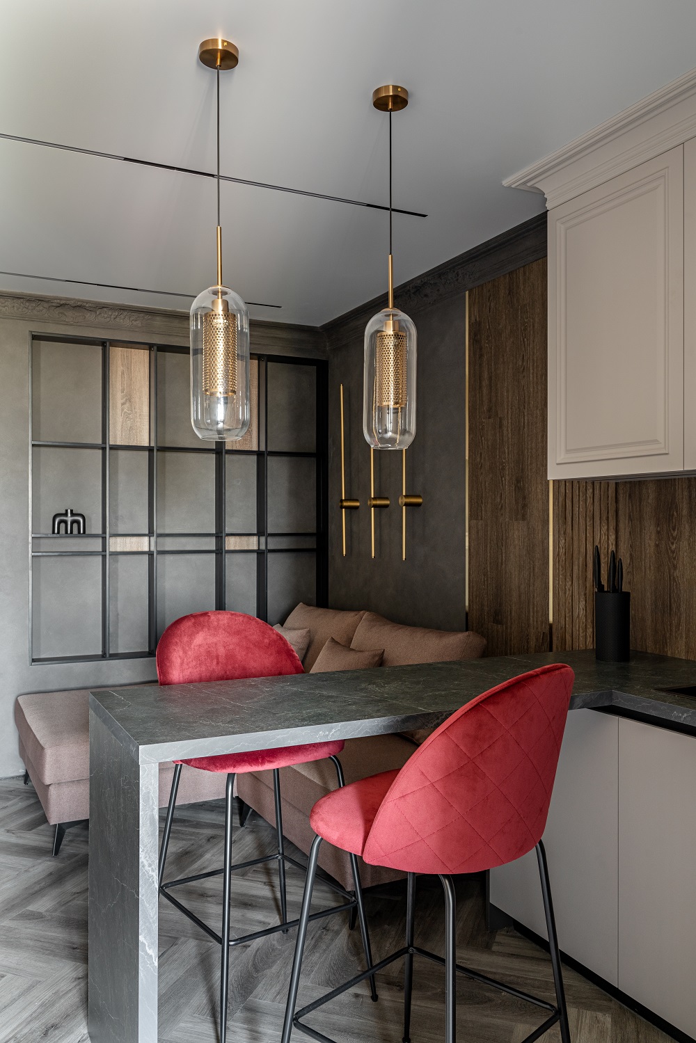Дизайнер интерьера Кристина Полякова создала этот интерьер на базе холодного пола Дуб Снежный, контраст которого подчёркивает рисунок ёлочкой. Аккуратные золотые акценты добавляют блеска и праздника в интерьер с серой основой. Красные бархатные стулья играют в той же команде.