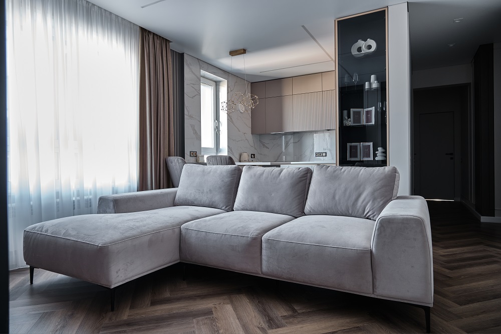 Так выглядит интерьер с серой мебелью и ёлочкой Дуб Ванкувер на полу. Акцентом стал чёрный стеллаж со стеклом и невесомая люстра.