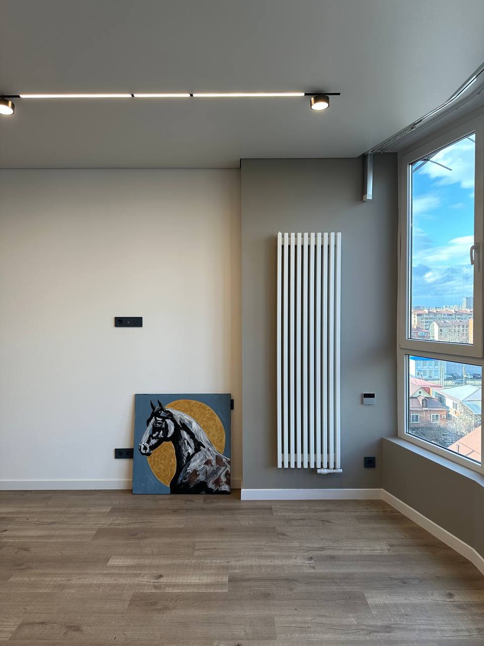 От застройщика был ровный наливной, проблем при укладке не было: сначала положил подложку, потом укладывал кварцевый ламинат. Замки с двух смежных сторон защелкиваются достаточно легко но надёжно, прямые подрезки делал монтажным ножом, фигурные около окна – лобзиком и болгаркой.